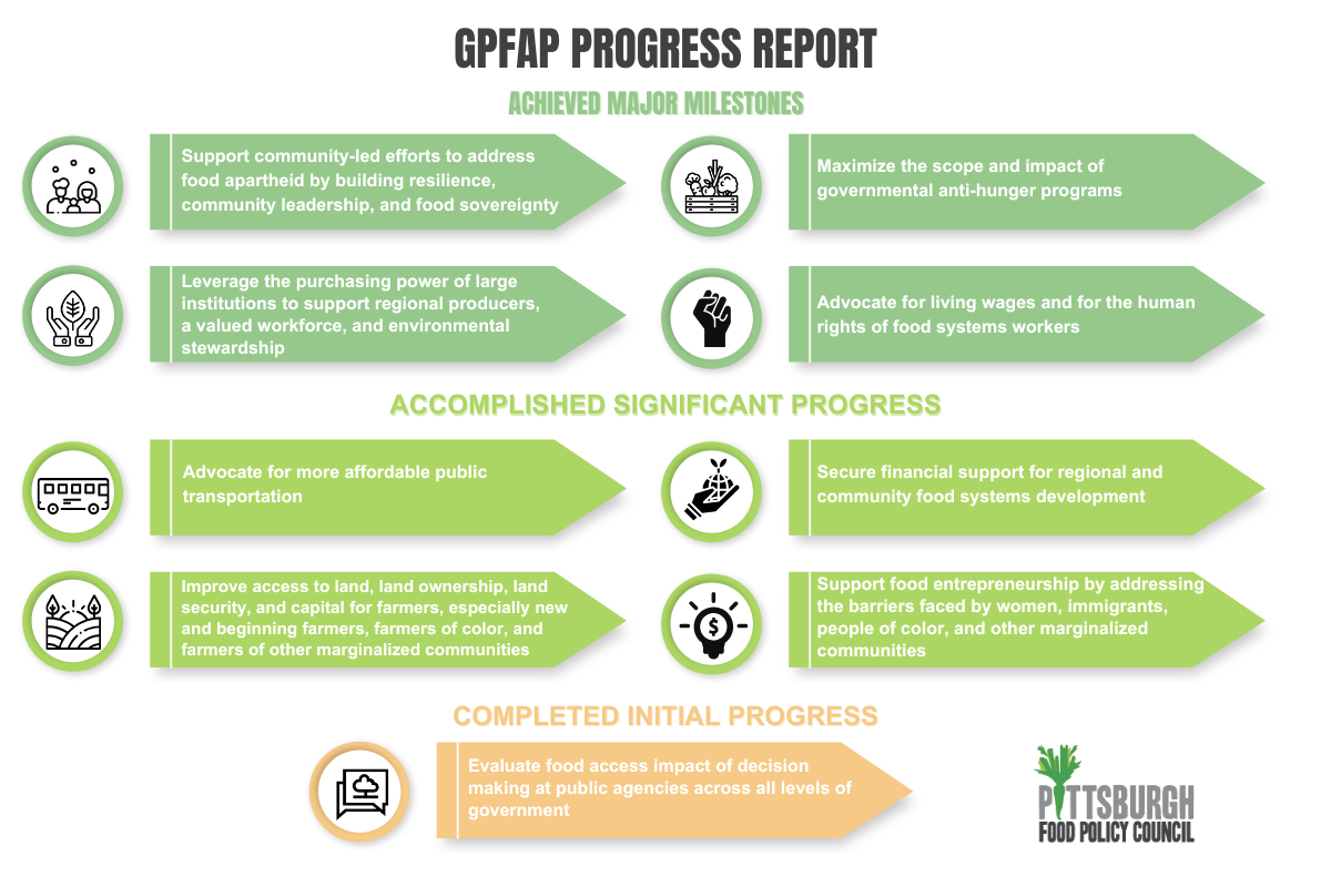 The Greater Pittsburgh Food Action Plan (GPFAP) is a community-driven framework for building a more just, sustainable, and resilient regional food system. The GPFAP is a community-centered approach to a policy roadmap and an action plan of strategies that prioritize healthy, affordable, and sustainable food for all. This page houses historic reports, progress updates, and resources to support ongoing food systems work across the region.